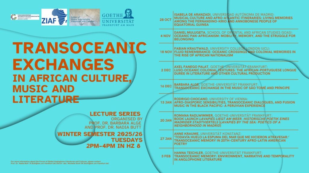 Keeping in mind the significance of these encounters and transactions for contemporary culture, music, and literature produced in and about Africa, this lecture series sets out to investigate and explore different dimensions of transoceanic exchanges with African countries from an interdisciplinary perspective. Particularly, the series seeks to delve deeper into the notion of transoceanic belongings (Kabir 2021), transoceanic entanglements (Teichler 2022), transoceanic imagination (2022 Wöll), to name but a few, from diverse perspectives. The prime objective of the series is to bring speakers from various fields of study to Goethe University to share their expertise in the form of a lecture. Not only does the series engage with transoceanic crisscrossing, intertwinements or histoire croisée (Zimmermann and Werner 2006) as manifested in the realms of culture, literature, film, music, and several other media, but it also approaches it as a space of trials and tribulations as well as transcultural transgressions and transformations.